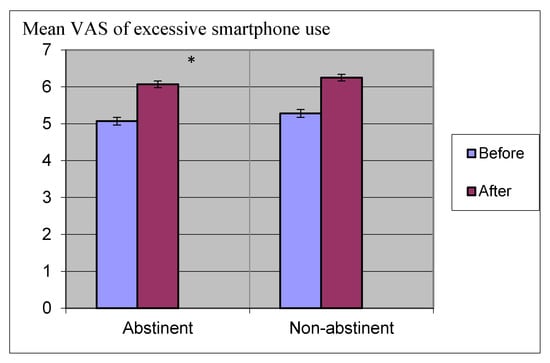Ratings of the smartphone addiction (VAS short) questionnaire before and after abstinence in the abstinent group compared with the non-abstinent control group. * p < 0.05.