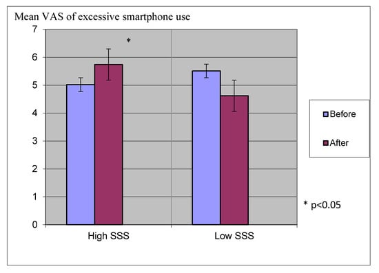 Scores of the smartphone addiction (VAS short) questionnaire, comparing high and low sensation seeking individuals after abstinence from smartphone use. SSS = Sensation Seeking Scale.