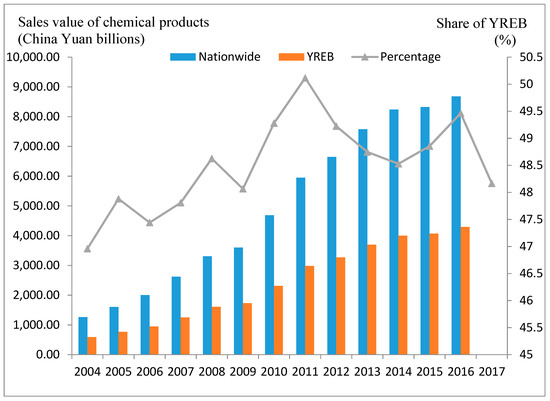 The sales value of chemical products in the YREB and its proportion in China.