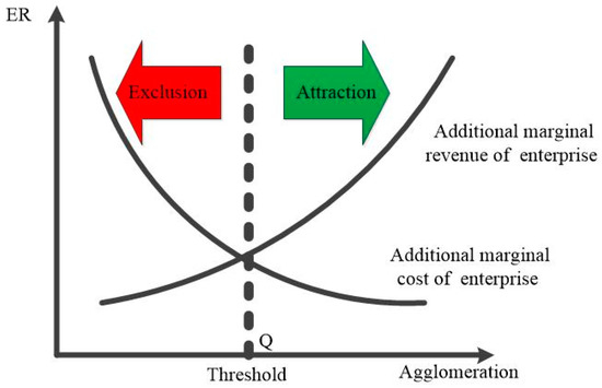 As shown in Figure 2, we denoted the point of intersection between the additional marginal revenue curve and the additional marginal cost curve of enterprises as point Q. Clearly, at point Q, the incremental marginal cost of enterprises (caused by ER) is exactly equal to their incremental marginal revenue (caused by industrial agglomeration). In other words, the ER intensity and industrial agglomeration level at point Q make the additional profit obtained by new entrants exactly zero. Therefore, the region neither repels nor attracts new polluting firms. However, before the industrial agglomeration reaches the threshold (i.e., to the left of point Q), the benefits of agglomeration will not cover the cost of environmental regulation, and the new polluting firms will not find the place attractive. As a result, this region shows a repellant effect on new polluting enterprises. Conversely, when the degree of agglomeration exceeds the threshold (i.e., to the right of point Q), the region is attractive to new polluting firms.
