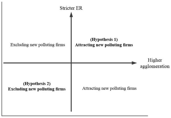 In general, environmental problems in regions with high industrial concentrations are more prominent, and thus, these regions are faced with more stringent ERs. In fact, people’s perceptions of environmental pollution are generally more closely associated with the industrial agglomeration than with individual firms [31]. Furthermore, these perceptions will eventually evolve into formal or informal environmental governance policy [19], which will increase compliance costs for firms. However, higher industrial agglomeration can improve the production efficiency of enterprises through knowledge spillovers, labor matching, and sharing of intermediate inputs, thus leading to higher income at the same time. Therefore, for new entrants, the final location depends on the tradeoff between these two opposite forces.