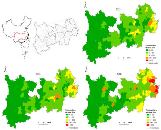 Based on the ASNCF database, we used ArcGIS to depict the characteristics of the spatiotemporal evolution of the location distribution of new chemical enterprises in the YREB (Figure 4). We chose three representative time-points of 2013, 2015, and 2018 to perform a detailed analysis. Overall, the number of new chemical enterprises is increasing. In 2018, the number of new chemical firms increased by approximately 2000, or more than 66% compared with that in 2015. Second, in terms of spatial distribution, new chemical firms have been continuously concentrated in the downstream coastal cities and the core cities in the middle and upper reaches in the past 6 years. In other words, the location of new chemical enterprises has a typical distribution feature of “center–periphery”. The core regions mainly include the downstream coastal cities, the middle and upstream provincial capitals, and economically developed prefecture-level cities. This result does not support the conclusion of many scholars that the ERs in different regions of China lead to the transfer of a large number of polluting firms from the east to the west [42].