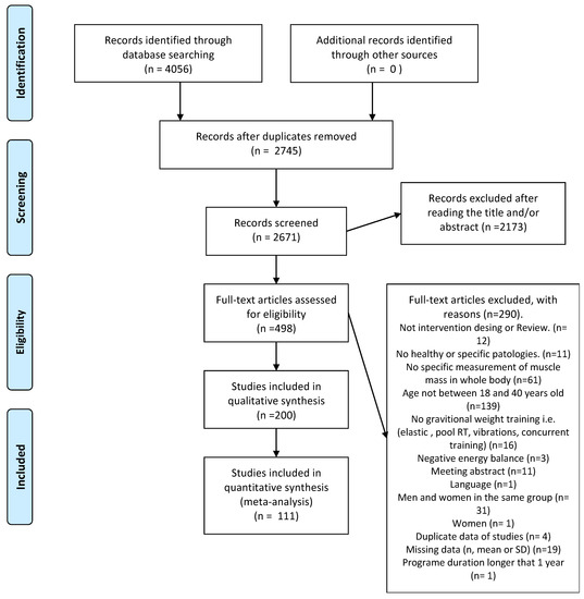 The initial search, which was based on the effect of resistance training on muscle mass, identified 4056 articles from the databases and no articles from other sources. After removing the duplicates, 2671 abstracts were screened, 2173 were excluded and 498 were screened as full texts. Finally, 111 studies (see Supplementary Table S1) were determined to fulfil the inclusion criteria and thus selected for the meta-analysis (Figure 1). Publications ranged from 1973 to 2018. The instruments used to carry out the measurements were anthropometry (n groups = 19), ultrasound (n groups = 1), Bod Pod (n groups = 3), bioelectrical impedance analysis (BIA) (n groups = 14), dual-energy X-ray absorptiometry (DXA) (n groups = 35), hydrodensitometry, hydrostatic weighing and underwater weighing (n groups = 10) FFM; anthropometry (n groups = 4), BIA (n groups = 1), DXA (n groups = 48), underwater weighing (n groups = 12) for LMM and anthropometry (n groups = 8) and DXA (n groups = 3) for SMM. The main characteristics and properties of the included studies are summarized in Supplementary Table S1.