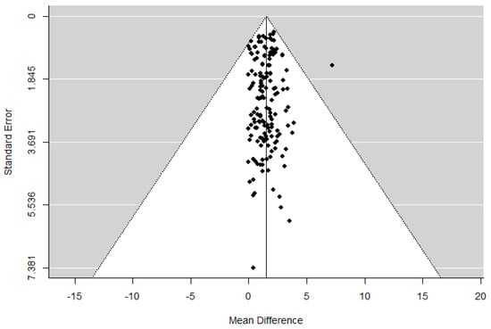 The meta-analysis and the statistical analysis were conducted using the Review Manager software (RevMan 5.2; Cochrane Collaboration, Oxford, UK). A random effects meta-analysis was conducted to determine the summary effect of RT on lean body mass, skeletal muscle mass or fat-free mass. The effects of training on these outcomes were expressed as mean differences (MD) and their 95% confidence intervals (CI). The heterogeneity between the studies was evaluated through the I2 statistic, and between-study variance using the tau-square (Tau2) [16]. The I2 values of 30−60% represented a moderate level of heterogeneity. A p value < 0.1 suggests the presence of substantial statistical heterogeneity. The publication bias was evaluated through an asymmetry test as estimated from a funnel plot (Figure 2). In addition, the Egger’s test was used to assess publication bias. A p-value of less than 0.05 was considered to be statistically significant.
