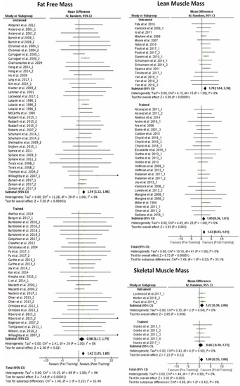 In addition, heterogeneity was not found for changes in hypertrophy for overall effects (Z= −0.078; p = 0.94). In addition, heterogeneity was not observed when studies were divided according to FFM (Z= −0.003; p = 0.99); LMM (Z = −0.25, p = 0.80) and SMM (Z = −0.58, p = 0.56).