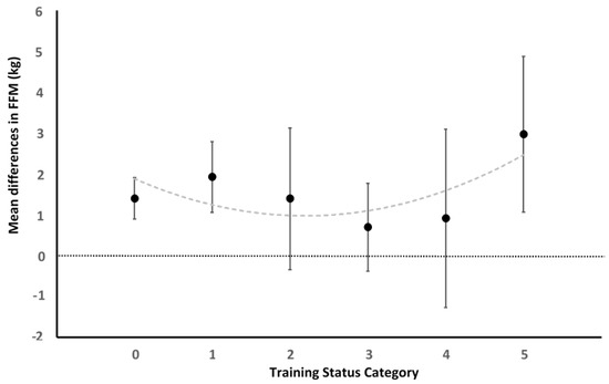 Performing a more detailed analysis of the training status on FFM, we found that the categories sedentary/untrained and physically active but no experience in RT, have higher and more significant values than the moderately trained (RT up to 1 year/intermediate, RT experience up to 2 years/intermediate, and RT experience up to 3 years/intermediate). Additionally, the highest values achieved are those obtained by the more experienced subjects, RT experience of 4 years or more/advanced (see Figure 4). However, no statistically significant differences between categories were observed (χ² = 5.79; p = 0.33).