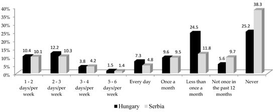 Similarly to previous research studies, this study showed that men in Serbia and Hungary are more likely to consume alcohol compared to women, which can be related not only to the cultural heritage and the generally accepted model of behaviour, but also to the greater economic power of men. Evidence suggests that the gender gap in socio-economic status is significant between the two countries [26,27,28,29,30].