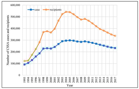 The Comprehensive Social Security Assistance (CSSA) is the most important welfare program in Hong Kong. Previously, this social security was called “public assistance”, which was introduced in 1971 and modified from the British National Assistance Act. Public assistance aimed to help the aged and the sick to maintain a basic living standard with a minimal allowance. It was in 1993 that public assistance was renamed CSSA. The applications of CSSA have to go through income and assets means tests. In the first year (i.e., 1993), the number of CSSA cases was 91,362 and the number of CSSA recipients was 121,060. There can be more than one recipient in one case, as the household is treated as a case unit and all the members within the household can be recipients.