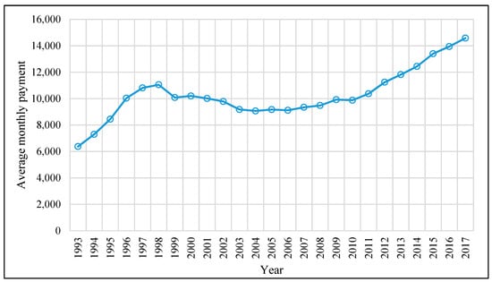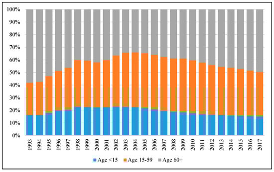 Figure 2 shows the age composition of the recipients. As shown, in 1993, those aged 60 and above accounted for almost 60% of recipients, whereas those aged 15–59 and under 15 occupied about 25% and 15%, respectively. The proportion of recipients aged 0–59 initially rose continuously, reaching about 66% in 2004; since then, it has started to decline and the proportion was about 50% in 2017. As the population continues to age rapidly due to low fertility and long life expectancy, the proportion of recipients aged 60 and above is expected to increase.