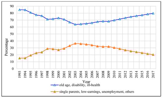 Figure 3 shows the distribution of CSSA cases by category. The proportion of CSSA cases under old age, permanent disability, and ill-health declined from 84.9% to 63.7% in the period of 1993–2004, and rose gradually after 2004, reaching 79.7% in 2017. The proportion of cases involving single parents, low-earners, the unemployed, and others, increased from 15.2% to 36.4% over the period of 1993–2003—with a particularly significant increase of 5% in 1997 due to the Asian financial crisis, and then started to decline during 2004–2017. In 2017, about 20.3% of the CSSA cases fell into these categories.