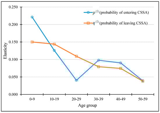 On the basis of the age-specific probability of entering and leaving CSSA, we performed the elasticity analysis. The results (in absolute values) are shown in