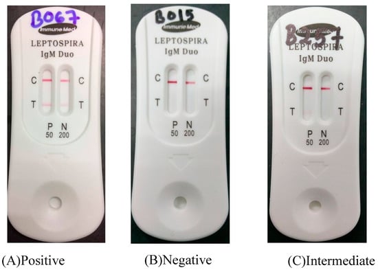 The test was valid if the red line appeared on the control line. Positivity was denoted by the presence of the red color line in T in both windows which are P 50 and N 200 (Figure 1). Then, the intermediate result was interpreted by the presence of the red color line in T in the P 50 window. Intermediate results were interpreted according to the region itself as Malaysia is an endemic region for leptospirosis. It was recommended by the manufacturer that the test result should be interpreted as intermediate or inconclusive rather than positive, and it was necessary to repeat the test within 2–7 days, if in an epidemic region, that results were interpreted as positive. IgM cut-off titer 50 and 200 were provided and could be used for probable diagnosis at any area in the world including epidemic and endemic regions. Figure 1 shows examples for the positive, intermediate, and negative results for the test. Samples with intermediate and positive results were further subjected to microscopic agglutination test (MAT) as the gold standard test for leptospirosis.