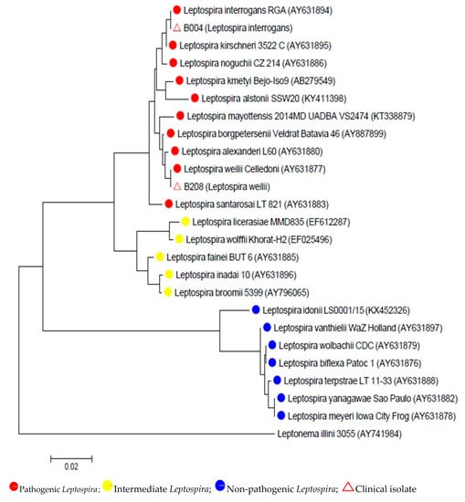 This phylogenetic tree showing evolutionary relationships of taxa of Leptospira spp. and the analysis confirmed that B004 and B208 were within pathogenic group.