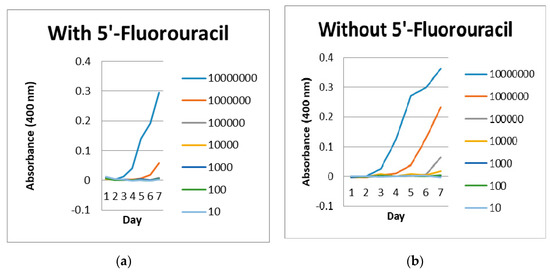 Graph of Leptospira growth with (a) addition of 5’-fluorouracil and (b) without addition of 5’-fluorouracil measured by microplate reader.