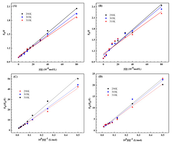 where F0 and F are the fluorescence intensities in the absence and presence of a quenching agent, respectively. KSV is the Stern–Volmer quenching constant calculated using a linear regression curve of F0/F versus [Q]; kq represents the quenching rate constant of biological molecules; τ0 is the average fluorescence lifetime without a quenching agent, and it is considered to be 10–8 s in general [31]; and [Q] is the concentration of the quenching agent. Under normal conditions, the maximum dynamic kq of various quenching agents is 2.0 × 1010 L/mol·s [31].