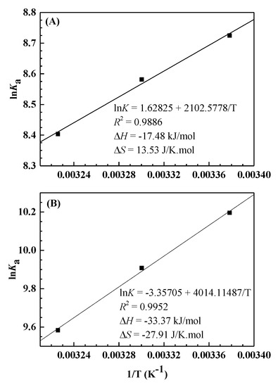 where K is similar to the effective quenching constant Ka, and R represents the gas constant. As we can see in Figure 3, there is a good linear relationship between lnK and 1/T, which means that the enthalpy change (ΔH) is constant. Then the free energy change (ΔG) is obtained according to the following formula: