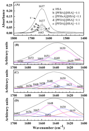 (1) The FT-IR spectra (A) of free HSA (a), difference spectra [(PFBA–HSA) – PFBA solution] ([PFBA]:[HSA] = 1:1) (b), difference spectra [(PFHxA–HSA) – PFHxA solution] ([PFHxA]:[HSA] = 1:1) (c), difference spectra [(PFOA–HSA) – PFOA solution] ([PFOA]:[HSA] = 1:1) (d), and difference spectra [(PFDA–HSA) – PFDA solution] ([PFDA]:[HSA] = 1:1) (e) in a pH 7.4 buffer solution in the region of 1800–1400 cm−1; (2) The curve-fit amide I (1700–1600 cm−1) region with the secondary structure determination of the free HSA (B), PFOA–HSA complex (C), and the PFDA–HSA complex (D) in a pH 7.4 buffer solution. [HSA] = 2 × 10–6 mol/L.