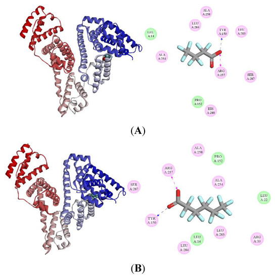 To study the binding affinities of PFCAs to HSA systemically, molecular modeling was applied by setting a simulation box to site I. The best energy-ranked result as shown in Figure 5 (left) demonstrated that PFCAs bind within the pocket of sub-domain IIA of HSA (site I), which is in accordance with the results obtained by Salvalaglio et al. [42]. The calculated lowest binding free energies (ΔG) are −24.28, −30.55, −34.74, and −40.18 kJ/mol for PFBA–HSA, PFHxA–HSA, PFOA–HSA, and PFDA–HSA, respectively, which indicates that PFCAs with a longer carbon chain have a lower ΔG suggesting a stronger binding affinity to HSA. This is in line with the fluorescence research. As described above, the van der Waals interaction energy and entropy change during binding related to carbon chain length could explain this phenomenon [34].