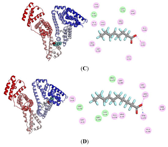 Left: Binding site of PFCAs on HSA (PDB ID: 1H9Z). HSA is shown in cartoon. PFCAs are represented using spheres. Right: 2D ligand interaction diagram of PFCAs with HSA using Discovery Studio with the essential amino acid residues at the binding site tagged in circles. Pink circles show the amino acids that participate in electrostatic interactions, and green circles show the amino acids that participate in van der Waals interactions. Hydrogen-bond interactions with amino acid side-chains (blue dashed arrow) and charge interactions (pink dashed arrow) are indicated. (A) PFBA–HSA; (B) PFHxA–HSA; (C) PFOA–HSA; and (D) PFDA–HSA.