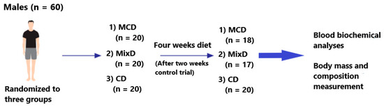 There is a lack of studies comparing the influence of a low-energy mixed diet and a low-energy moderate-carbohydrate diet on body mass, body fat, and blood biochemical parameters. The aim of our study was to establish which diet, a low-energy moderate-carbohydrate diet (MCD) or a low-energy mixed diet (MixD), is better at reducing body mass, fat, and muscle mass and positively influences blood lipoproteins, glucose, and CRP in overweight and obese middle-aged men.