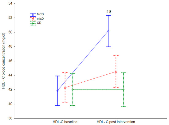 Differences in HDL-C postintervention between the moderate-carbohydrate diet (MCD). Values are expressed as mean and standard deviation. Mix diet (MixD) and conventional diet (CD) groups; #—significant difference compared with base line, $—significant differences compared with the MixD and CD groups, respectively (p < 0.05).
