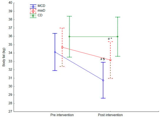 Differences in body fat weight (kg) postintervention between the moderate-carbohydrate diet (MCD), mix diet (MixD), and conventional diet (CD). Values are expressed as mean and standard deviation. (CD) groups; #—significant difference compared with the baseline, $—significant differences compared with the MixD and CD groups, respectively (p < 0.05), *—significant difference compared with the CD groups.
