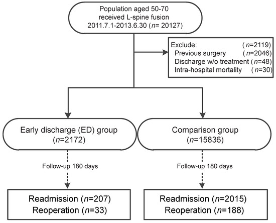 A total of 18,008 patients who underwent lumbar spinal fusion surgery between July 2011 and June 2013 were identified in and extracted from the NHIRD (Figure 1). Among them, 2172 patients were categorized into the ED group, who had less than 72 h of hospitalization (including the preparation period which commonly took approximately one day) for the surgery. The other 15,836 patients were categorized as the comparison group, who were hospitalized for more than 72 h but less than 12 days. All patients were then followed-up for 180 days after the indexed surgery of lumbar fusion.