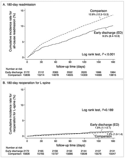 Generally, one out of ten patients (about 10%) had been hospitalized after their index lumbar spinal surgeries and a portion of patients (1%) even had secondary surgery on their spine. The cumulative incidences of readmission in the ED group (9.5%) were lower than that in the comparison group (12.8%, p < 0.001), whereas reoperations were insignificantly different in both groups (1.5% vs. 1.2%, p = 0.189) (Figure 2).