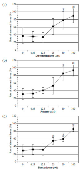 First, the larvae were treated with PAH, starting at the 1-cell stage to the swimming larva stage (20 h after fertilization). All three examined PAH types exerted a concentration-dependent adverse effect on larval development. While normal larvae have a straight tail, PAHs induce bending in the tail of larvae. Compared to the control, dibenzothiophene and fluorine administered at 100 µM and 50 µM significantly increased the percentage of abnormal larvae (Figure 1a,b). Phenanthrene significantly increased the percentage of abnormal larvae at concentrations of 100, 50, and 25 µM (Figure 1c).