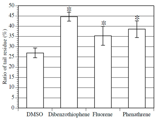 PAH treatment was conducted on larvae, starting with swimming larvae 20 h after fertilization to early juveniles 90 h after fertilization, and the effect of PAH on metamorphosis was examined. The effect of PAHs on the rate of normal metamorphosis could not be determined because the metamorphosis rate varied randomly. Next, we focused on the ratio of tail residue length to body length in early juveniles. The tail residue is a mass of tail cells absorbed by the trunk at the beginning of metamorphosis, and it normally shrinks as metamorphosis progresses. The ratio of the tail residue diameter to the juvenile body length was measured, and the measurement results were compared between the early juveniles treated with 100 µM of each PAH and the control early juveniles. The ratio of the diameter of the tail residues to the body length was significantly higher in the PAH-treated early juveniles than in the control early juveniles (Figure 2). In particular, dibenzothiophene-treated early juveniles exhibited the greatest difference compared to control early juveniles. The results described above suggest that the three types of PAHs adversely affect tail absorption during metamorphosis.