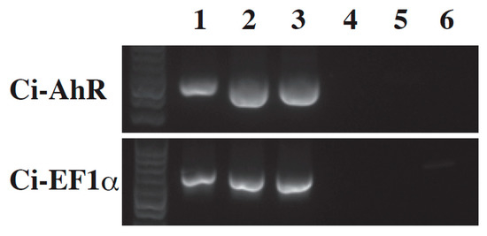 RT-PCR analysis of Ci-AhR and Ci-EF1α. Ci-AhR mRNA expression was determined in the swimming larva (lane 1), mid body axis rotation (lane 2), and early juveniles (lane 3) stages. No amplification was detected in the no reverse transcription template (lane 4–6). Ci-EF1α was amplified as an internal control.