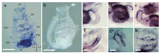 Whole-mount in situ hybridization (WISH) analysis of Ci-AhR mRNA in Ciona juveniles. (a) Ci-AhR mRNA localization using antisense Ci-AhR probe. (b) WISH analysis using sense probe of Ci-AhR. No signal was detected. Magnifications of (a) are presented in (c–h). a, anterior; as, atrial siphon; bs, branchial sac; d, dorsal; en, endostyle; esp, esophagus; int, intestine; nc, neural complex; os, oral siphon; p, posterior; st, stomach; v, ventral. Scale bars in (a,b) and (c–h) are 500 and 100 μm, respectively.