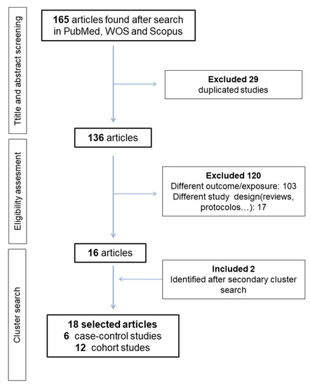 Figure 1 summarizes the selection process of the articles. Our search strategy returned 165 records. After exclusion of duplicates (29 papers) and screening of the title and abstract, 16 studies remained for full text evaluation. All these studies fulfilled the inclusion criteria. A cluster manual search resulted in the location of two additional studies. Thus, a final 18 published studies were included in this review: 12 cohort studies and six case-control studies [25,38,39,40,48,49]. Among cohort studies, 10 collected exposure at recruitment [35,36,37,50,51,52,53,54,55,56] and two included retrospective information collection [24,52]. As two manuscripts provided data from the same cohort [53,54] we only included the most recent one in the meta-analysis [54]. Thus, a total of 17 studies were included in the meta-analysis and 18 studies were included in the systematic review.