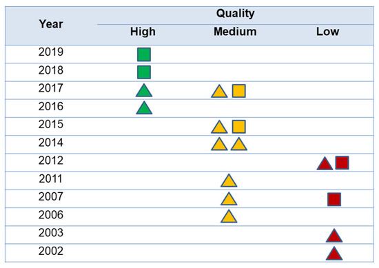 The quality of the studies according to the NOS scale by publication year is shown in Figure 2. Only four studies (22.2%) could be considered as having high quality, and most of the others had medium to low quality. No statistical differences were observed between quality degree and type of design (p > 0.05). A trend to quality improvement of studies over the years was observed, with most recent articles showing better quality than previous ones.