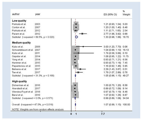 Figure 3 presents the results of the general meta-analysis forest-plot and considers the quality score of the studies. The pooled analysis resulted in an OR of 1.07 (95%CI 0.99 to 1.15), with moderate heterogeneity (I2 = 47.5%; p = 0.016), but there were differences among quality categories: for high and medium quality studies estimates were similar (ORhigh: 0.99; 95%CI 0.89 to 1.08; ORmedium: 1.05; 95%CI 0.96 to 1.15), but those with low quality had a higher weighted OR: 1.33 (95%CI 0.98 to 1.68). In addition, in low-quality studies heterogeneity was still high and in medium-quality studies was moderate especially due to two studies: Parent et al. and Behrens et al. [25,36], the studies with lowest sample size and highest OR reported. As these studies may be impacting the meta-analysis results, a sensitivity leave-one-out analysis was done. No differences were detected in the final estimation and, therefore, these studies were included in the final meta-analysis.