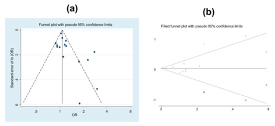 (a) Funnel plot of the studies analysing prostate cancer and shift or night work. (b) Symmetric funnel plot for the estimation of the studies needed to solve the publication bias.