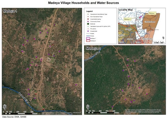 The study was performed in Madeya village, located in uMkhanyakude district of KwaZulu-Natal province, South Africa (Figure 1). Madeya is just one of the sites where the large study is being conducted. UMkhanyakude district is one of the poorest districts in KwaZulu-Natal and much of it is characterized by poor economic development. Most of the rural areas within the district are poor, have limited infrastructure and experience poor service delivery []. Water supply is poor and sanitation facilities are inadequate, thus creating a conducive environment for transmission of infectious diseases such as schistosomiasis and soil transmitted helminths [,].