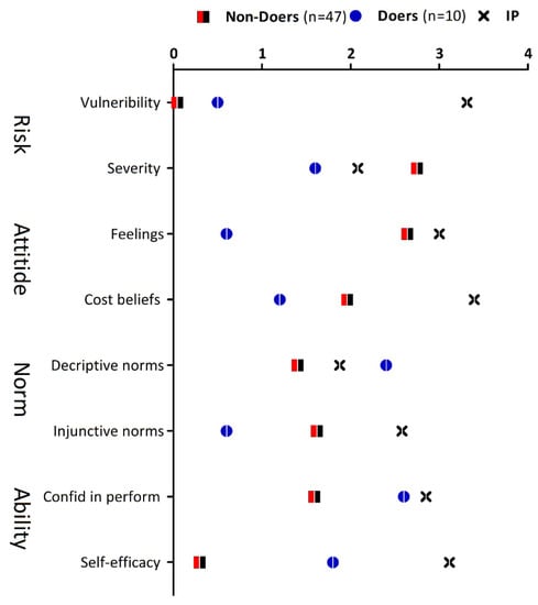 To measure attitudes, feelings towards collecting water from a safe source were measured by asking the respondents how they felt about collecting water from a safe source. The outcome was moderate (M = 2.286; SD = 3.03) with a large difference of 2.04 scale points between the two groups of doers and non-doers. The difference (t = −1.978, p = 0.026) between doers and non-doers. The mean score for cost benefit was low (M = 1.825; SD = 2.399) with a moderate insignificant difference (t = −0.905, p = 0.184) between doers and non-doers of 0.76 scale points. Both attitudinal subscale scores were low, indicating that respondents had negative feelings towards collecting water from a safe source and found it very time consuming and effortful. The IP for all factors within the component attitude were therefore high.