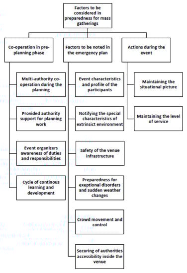 In this study, we are interested in factors involved in all aspects of preparedness for mass gatherings from the rescue authorities’ point of view. According to previous research, mass gatherings cause an increased workload for emergency medical services (EMS), hospitals, and police forces [,,,]. According to Zeitz et al. [], an increase in workload for rescue service operative resources is minor and their role in mass gatherings is characterized as being on standby in case of incident []. Different factors were shown to have an impact on the need of transport to hospital, the number of patients, and the injury patterns. These include weather [,], the level of the on-site medical care [,,,,,,,,], audience profile [], event type [,,], duration [], and geographical location []. Alcohol and drug use, attendance, and the age and mood of the crowd can also have an effect on the level and the need of medical response []. The history of disasters in mass gatherings represents various reasons for casualties, including overcrowding and crowd control issues, limited event access, issues in fire safety, limited medical preparedness, and limited emergency response []. In addition, weather and environmental hazards cause casualties in mass gatherings []. Previous literature from the viewpoint of preparedness includes research in predicting the resource use and the need for first aid services and transport to hospital [,,]. Despite the fact that preparedness for mass gatherings and inspection of the emergency plans of events is the rescue authorities’ work on a daily basis as part of their legal duty of accident prevention, their own point of view regarding all aspects of preparedness for mass gatherings is missing from the literature.