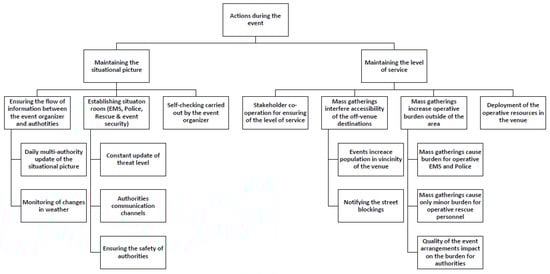 The actions during the event sub-category was split into two generic categories of maintaining the situational picture and maintaining the level of service (Figure 4). In order to maintain the situational picture, the flow of information between the event organizers and the authorities needs to be ensured by daily multi-authority updates and constant monitoring of changes in the weather. Establishing a situation room for the key players including EMS, police, rescue service, and event security participants strengthens the situational picture by constant update of threat level, authorities’ communication channels, and ensuring the safety of the authorities. Self-checking carried out by the event organizer is also a vital factor in maintaining the situational picture.