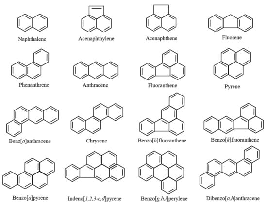 Chemical structure of the 16 representative polycyclic aromatic hydrocarbons (PAHs) as decided upon by the United States Environmental Protection Agency (US EPA).