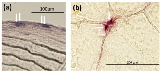 A teleost scale is a calcified tissue in which osteoblasts (Figure 2a), osteoclasts (Figure 2b), and a calcified bone matrix coexist [72,73,74,75,76]. The bone matrix, which includes type I collagen [77], osteocalcin [78], osteonectin [79], and hydroxyapatite [80], is present in scales, as well as in mammalian bone. Teleost scales have an important function in regulating blood calcium levels. Teleost scales are known to function as internal calcium reservoirs similar to those in the endoskeletons of mammals [81,82,83].