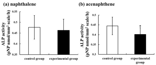 Effect of naphthalene (a) and acenaphthene (b) (each 6 ng/L) on alkaline phosphatase (ALP) activity in cultured scales incubated for 6 h. The results are expressed as the means ± SE. The statistical significance between the control and experimental groups was assessed using a paired t-test. In all cases, the significance level was selected at p < 0.05. *: p < 0.05; n = 9 samples; one sample per fish. Data from Suzuki et al. [95].