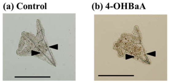 Until now, the sea urchin has been used in ecotoxicological studies [125,126]. The effect of various chemicals, including PAHs, on the development of sea urchins has been evaluated [127,128,129]. In the marine environment, the lipids and organic carbons of invertebrates have been exposed to and accumulated PAHs [130]. However, the influence of OHPAHs on invertebrates has not been reported yet. Thus, we have noted that the sea urchin is an established experimental animal for toxicological studies in invertebrates, and we examined the effect of both PAHs and OHPAHs on the embryogenesis of sea urchins. The results were described in Suzuki et al. [131]. Adult sea urchins (Hemicentrotus pulcherrimus) were collected from the shore of the Toyama Bay side of the Noto Peninsula. Spawning was induced via the intracoelomic injection of KCl (0.5 M). Eggs and sperm from spawning animals were collected in 50 mL beakers containing filtered seawater (FSW). Prior to fertilization, the eggs were washed twice with FSW. Eggs that reached at least 95% fertilization within 10 min postinsemination were used. The eggs were divided into control and experimental groups. After fertilization, BaA and 4-OHBaA were added to seawater at concentrations of 10−8 and 10−7 M, respectively, and kept at 18 °C while mixing lightly. There were no differences in the external features of the control and experimental groups in the blastula and prism stages. In the pluteus stage, morphological features changed. Spicule lengths (arrows in Figure 4) were measured using embryos crushed by a cover glass. Spicule lengths were significantly suppressed by 4-OHBaA (10−8 and 10−7 M). Figure 4 indicates the influence of 4-OHBaA on the early development of sea urchins compared with the control. BaA (10−7 M) suppressed the spicule length significantly, while the length did not change with BaA (10−8 M). The mRNA expression of the Hemicentrotus pulcherrimus spicule matrix protein 50 gene, which is a kind of spicule matrix protein, decreased significantly with 4-OHBaA treatment. Hemicentrotus pulcherrimus E26 transformation-specific gene 1 and Hemicentrotus pulcherrimus Aristaless-like homeobox gene 1, which are important transcription factors related to spicule formation, were significantly inhibited with 4-OHBaA. To determine the 4-OHBaA in BaA-treated embryos, pluteus-stage embryos treated with BaA (10−7 M) were analyzed using high-performance liquid chromatography with fluorescence detection. As a result, 4-OHBaA (1.55 pmol) was detected in the BaA-treated embryos, although 4-OHBaA was not detected in the control embryos. In addition, our further study indicated that BaA and 4-OHBaA treatment significantly inhibited the expression of vascular endothelial growth factor (VEGF) and heparan sulfate 6-O endosulfatase [132], suggesting that BaA and 4-OHBaA suppress spicule formation via disturbing the VEGF signaling pathway. Considering these facts, we believe that OHPAHs converted from PAHs are toxic substances that inhibit early embryogenesis in sea urchins and fish.
