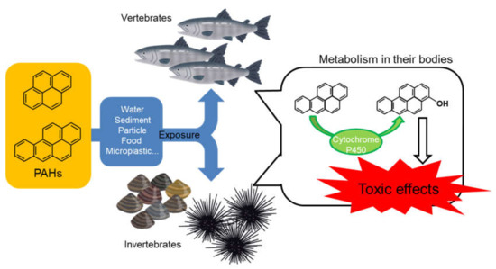 The accumulation of low-molecular-weight PAHs is higher than that of high-molecular-weight PAHs in both fish and invertebrates [182], and this trend is more prominent in invertebrates. This phenomenon would be caused not only by bioavailability, such as the higher water solubility of low-molecular PAHs, but also by other biological factors. Thomann and Komlos [183] studied a model of biota-sediment accumulation factor for PAHs using sunfish and crayfish and found the high-metabolism capacity of PAHs (especially log Kow > 5) and slow absorption in the intestines while digesting. Additionally, they suggested that fish had a higher metabolism capacity of high Kow PAH compared to invertebrates, which indicates that differences in PAH bioaccumulation between fish and invertebrates may be induced by differences in their metabolisms. It is known that the CYP1A family has an important role in metabolizing PAHs [184], and CYP1A homologues are very consistent in vertebrates. However, although some studies indicate that the CYP family contributes to PAH metabolism, characteristics of CYP1A for PAH metabolism in invertebrates are still unclear.