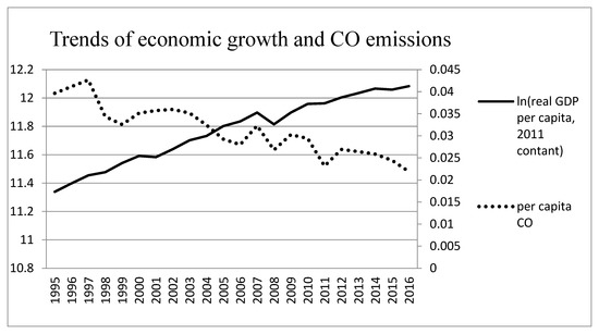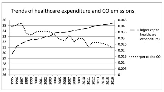 Our empirical study uses the quarterly time series data on per capita carbon monoxide (CO) emissions (in parts per million, ppm), real GDP per capita, and healthcare expenditure per capita for the 22-year period from 1995 Q1 to 2016 Q4 in Taiwan. The data of CO is from the Environmental Protection Administration in Taiwan. The data of real GDP per capita is from national statistics in Taiwan. Real GDP per capita is measured in New Taiwan Dollars (NTD), considering 2011 prices. The data of healthcare expenditure is from the Ministry of Health and Welfare in Taiwan. We transformed the data including real GDP per capita and healthcare expenditure per capita into natural logarithms. The historical trends of per capita CO emissions, real GDP per capita, and healthcare expenditure per capita for Taiwan are illustrated in Figure 1, Figure 2 and Figure 3; dashed line, dotted line and solid line represent healthcare expenditure per capita, per capita CO emissions and real GDP per capita, respectively.