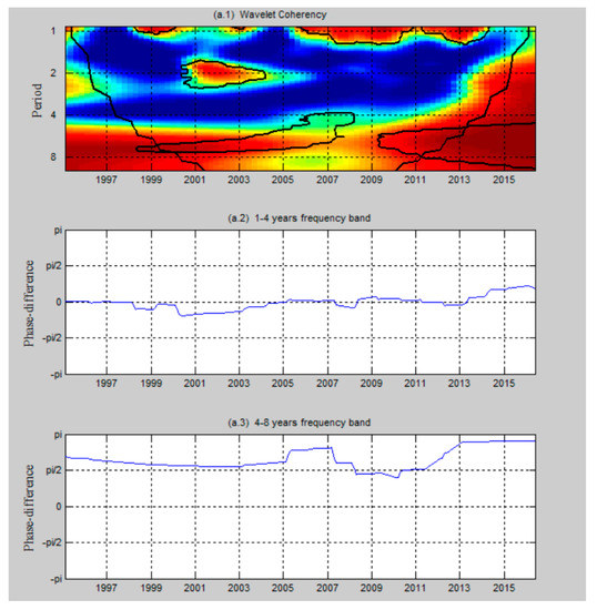 The phase variations in this paper are shown as arrows in the wavelet coherency plots. Arrows which point to the right-hand direction indicate that and are in phase (or positively associated), whereas arrows which point to the left-hand direction indicate that and are out of phase (or negatively associated). Furthermore, arrows which point towards other directions indicate leads or lags between them. For instance, arrows which point in an upwards direction indicate that leads by one-quarter of the corresponding measurement and that it lags behind by three-quarters of the corresponding measurement. It is also worthy of mention that phase differences may imply causality between and [36,47].