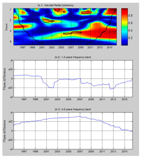 The partial wavelet coherency (b.1) and partial phase difference (b.2,b.3) between per capita CO emissions and healthcare expenditure per capita, with real GDP per capita as a control variable. The y-axis refers to the frequencies; the x-axis refers to timespan 1995–2016.