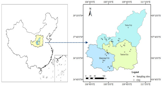 The sample collection was undertaken in July 2017 during various trips. The places for sampling belonged to the regions of Yan’an, Yulin, and Qingyang producing oils (Figure 1). All soil samples were taken near oil wells, but away from the apparent oil flows into the soil. A stainless-steel soil auger was used to collect 5 different samples at a depth of 0–10 cm soil layer and a composite sample was achieved by mixing the 5 samples. The above sampling process was repeated three times, that is, there were three composite samples at each sample point. After being taken to the laboratory, grounding of the samples was carried out followed by sieving with a sieve of stainless-steel with 60 mesh sieve and storage at 4 °C prior to analysis.