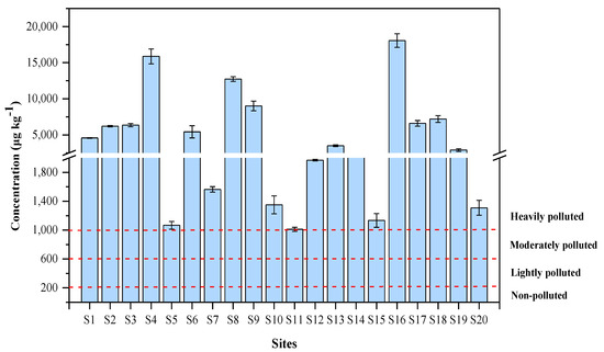 The soil PAHs pollution was separated into four grades with reference to the soil quality standard proposed by Maliszewska-Kordybach [22]. The total concentration of 16PAHs below 200 µg kg−1 indicates non-polluted, with lightly polluted being indicated by a concentration of 200–600 µg kg−1, and a concentration of 600–1000 µg kg−1 representing moderately polluted. When the concentration exceeds 1000 µg kg−1, the area is heavily polluted. Compared to the above classification standards, all sites were heavily contaminated (Figure 2).